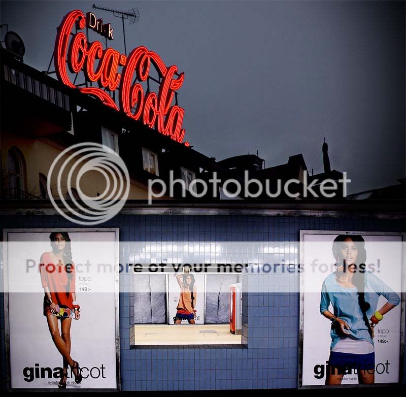 Ha ha! Ja det blev nog kanske lite mycket av den varan, men jag tycker att det passar på cola-bilden, det tillför en aura av ålder till bilden, lite som att bilden kan vara från 60-talet eller nått. På Gina Tricot-bilden skulle jag ha hukat mig mer så att ansiket syntes bättre på bilden i mitten, nu blir det liksom en taklampa i skallen på henne. 36:an var mest en grej jag gjorde för att vinkla bort mig själv i reflektionen, men kul att du gillar kompositionen, jag själv anser den lite tam.