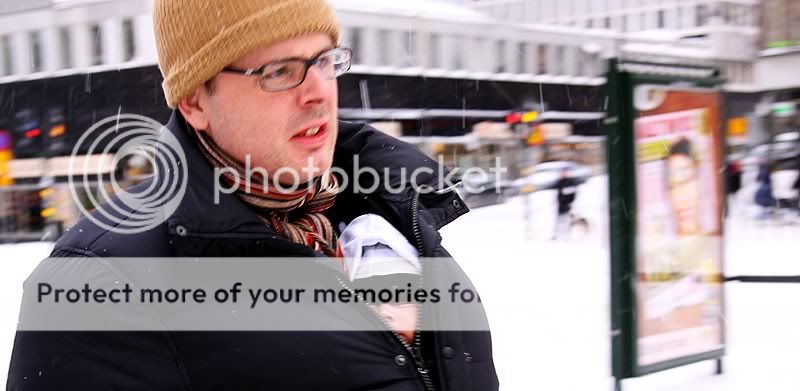 Plåta denna bilden när jag stod på Odenplan och väntade på Twär Wallin (han nedanför med en kamera i plytet). Helt sonika kommer det en man med sitt barn instoppat i innerfickan, som en glaciärvariant av en känguruhanne. Synd bara att ja inte hann med att vrida ner slutaren, blev lite paff.