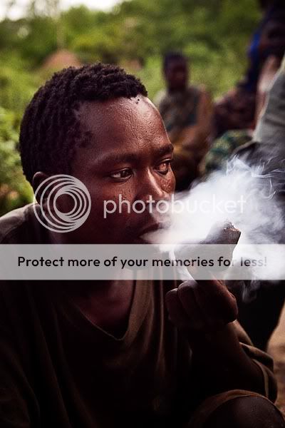 Röka fanns det dock i den lilla stammen vi var hos. Oklart vad de rökte men jag kände mig inte så sugen på att prova. Mannen på bilden sa att om jag kom dit senare skulle de bjuda på fest.... och fest för Hatzabe är en måltid på rå babianhjärna. Sjukt lockade konstigt nog men tyvärr blev det inte av. Värt att tillägga är att de inte tillagar mat, de äter den som den är... rätt på bara. Att hänga och jaga med stammen var en av de absoluta höjdpunkterna under Afrikatrippen, och jag fick mycket kredd för att jag pallade o hänga med i deras jakttempo trots att jag var en "viting". Men å andra sidan. De bor i grottor, jag bodde i tält... så värst ball var man kanske inte ändå. Minns jag det rätt så hade mannen på bilden förlorat ögat i en parasitinfektion, någon som var väldigt vanligt hos dem.